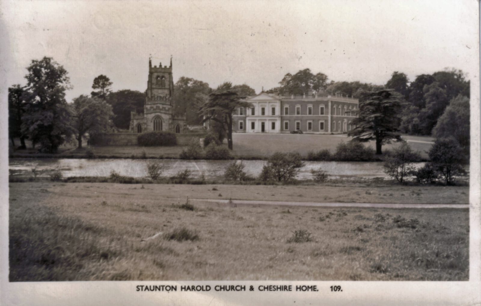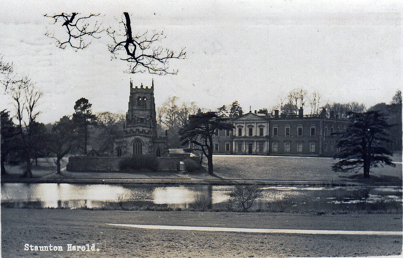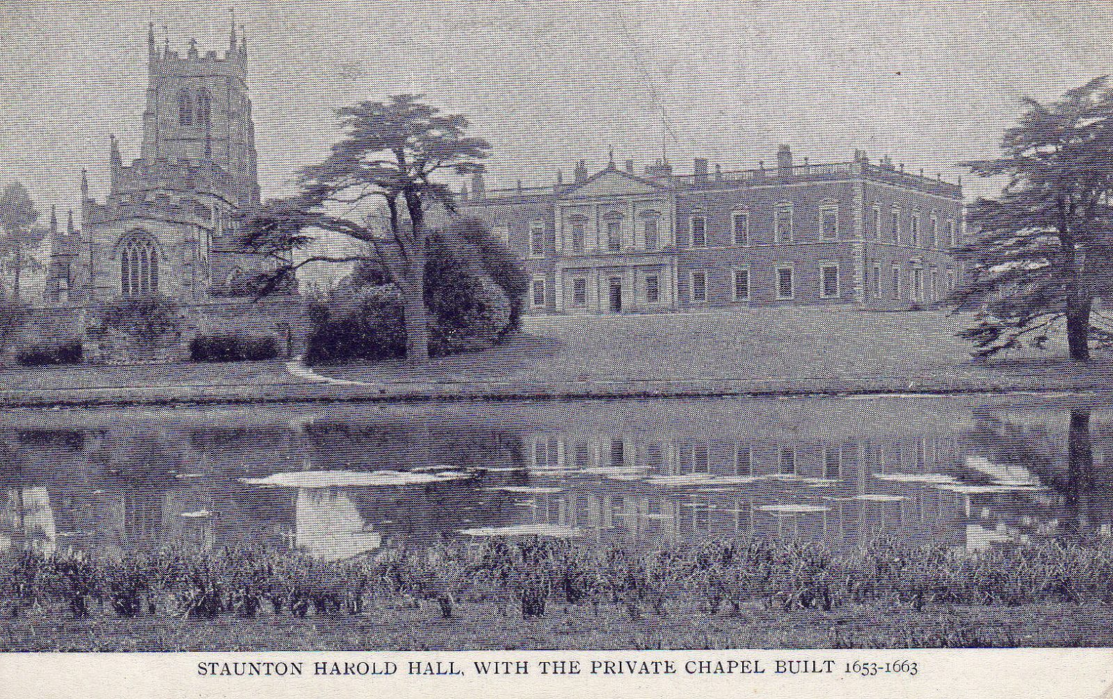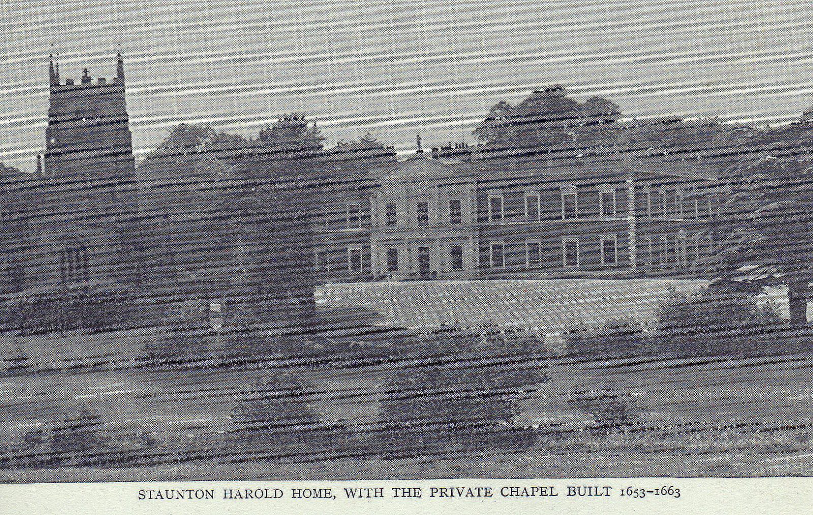 Staunton Harold Hall stands in a small valley.