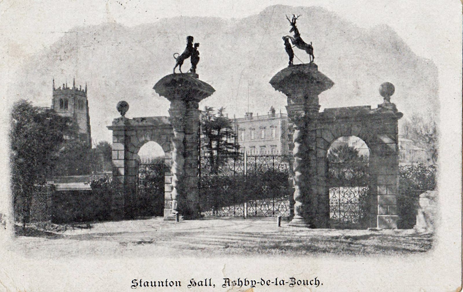 Description: The Golden Gates Ornate gateway is late 17th century Baroque. The rusticated stone piers and barley sugar Ionic columns bear entchlatures and segmental pediments. They are flanked by late 18th century pedestrian archways with round arches and rusticated with entchlatures. The gateway formerly contained wrought iron gates and a heraldic crest. Shields once capped the piers. The gate piers were originally at the entrance to the bowling green in the formal gardens laid out by the 1st Earl Ferrers. They were probably moved to their present position by the 5th Earl when he re-landscaped the area; the outer pedestrian archways probably date from this period. The hound and stag on the top of the piers are the supporter of the Shirley family coat of arms.